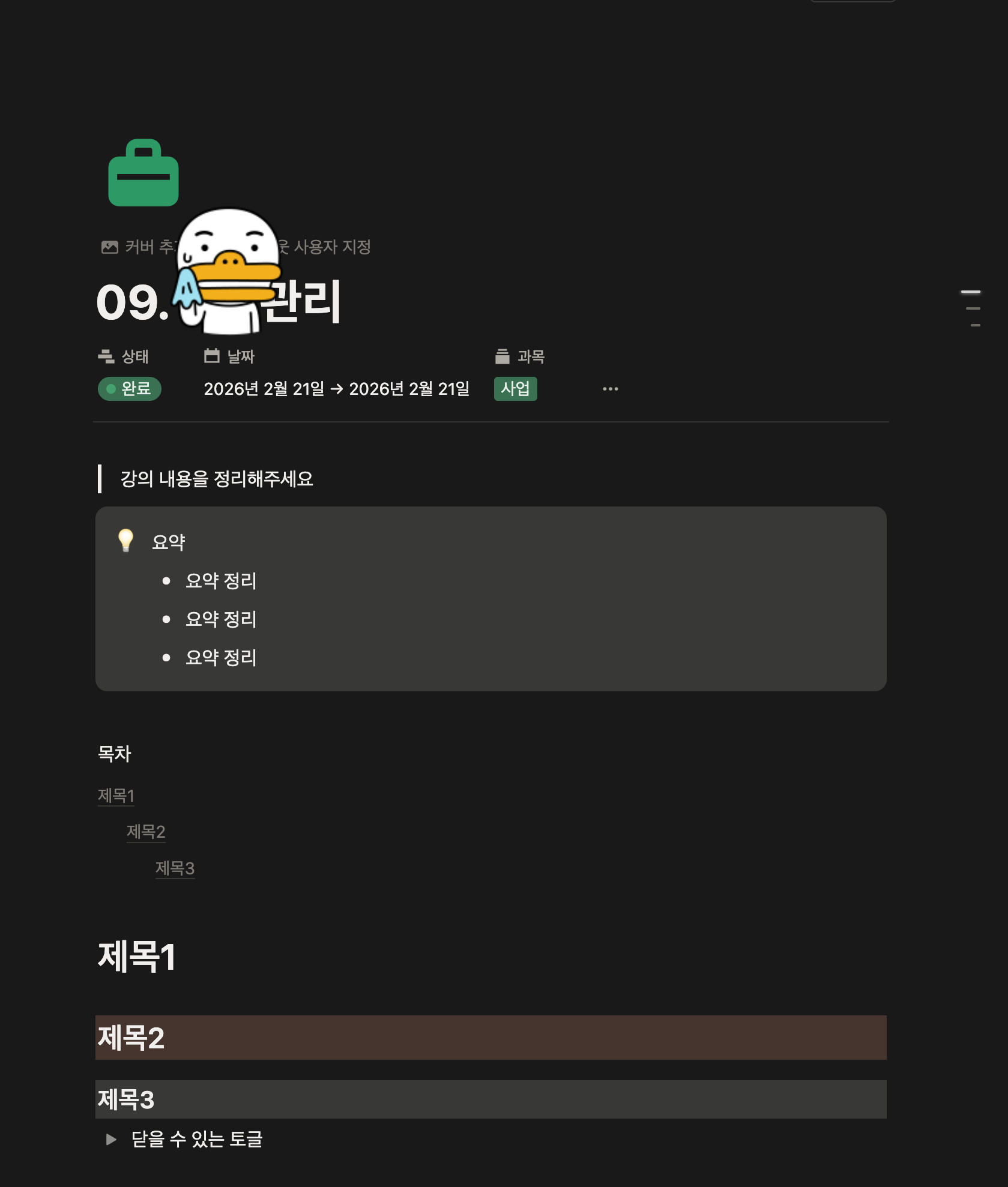 지금은 타이핑하면서 머리에 넣는다. 가끔은 그것도 귀찮아서 NotebookLM에 요약을 시키고 붙여넣는다. 과목별로 목차를 뽑아 달라고 하면 귀신같이 작성해주기 때문에 시간을 줄일 수있다.